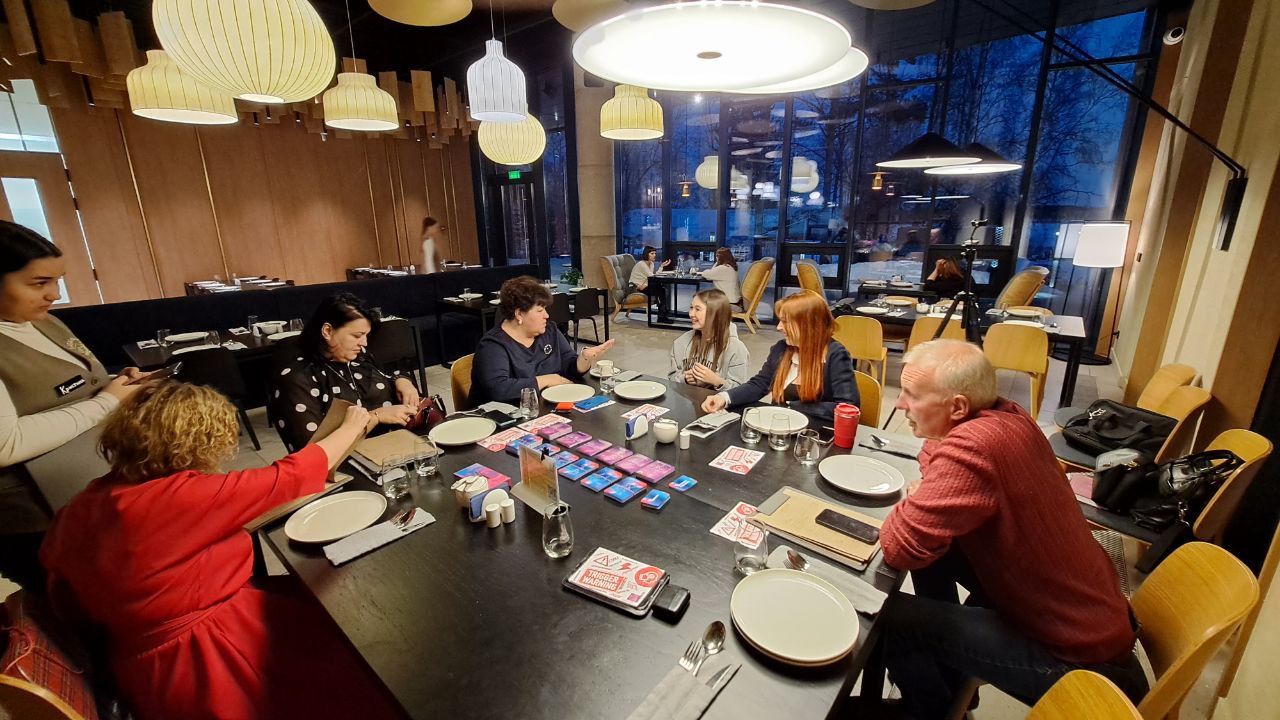 Знакомство с участниками, заказ еды, напитков, ведущий объясняет правила игры